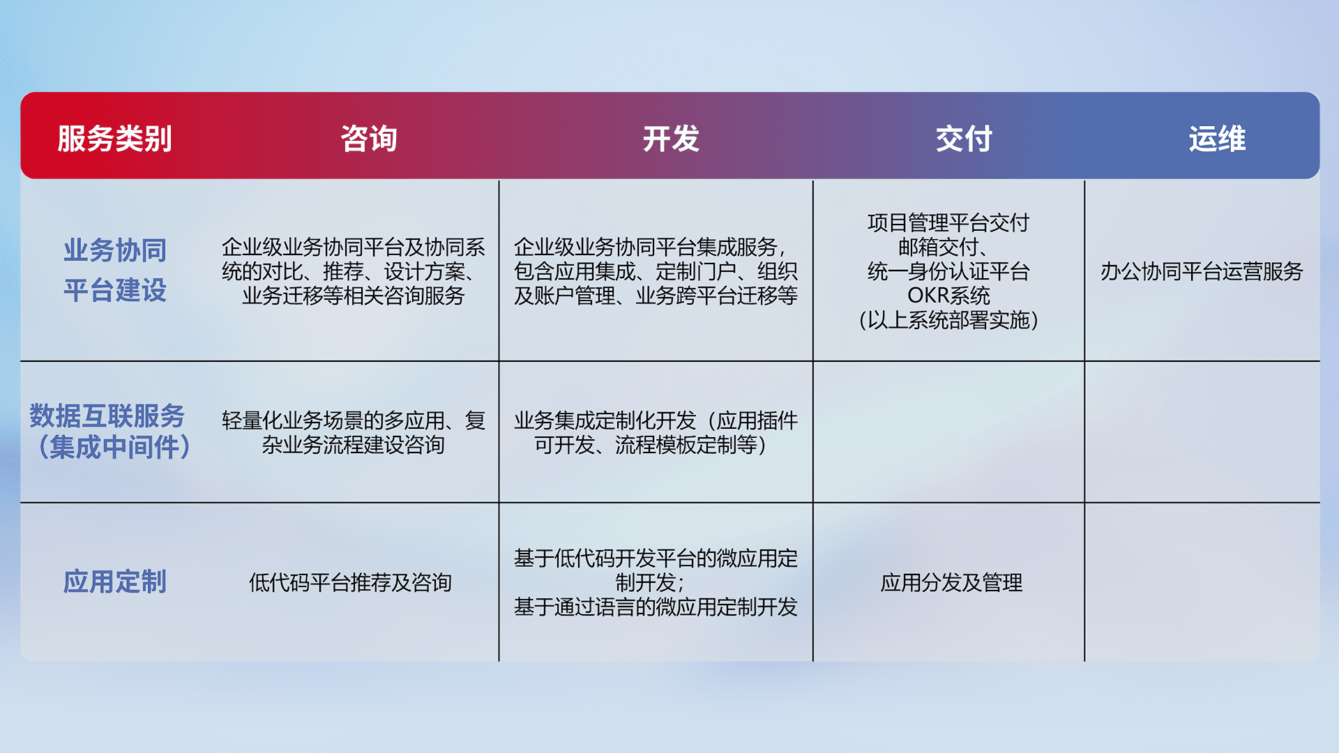 针对钉钉、、、企微、、IDaas等平台级产品提供产品的规划、、、、方案、、交付、、、定制化开发等服务,,,,实现如统一协同办公、、、、智能客户服务、、、混合会议管理、、、、智能数据查询、、、等业务场景,,,实现数字化转型。。。。