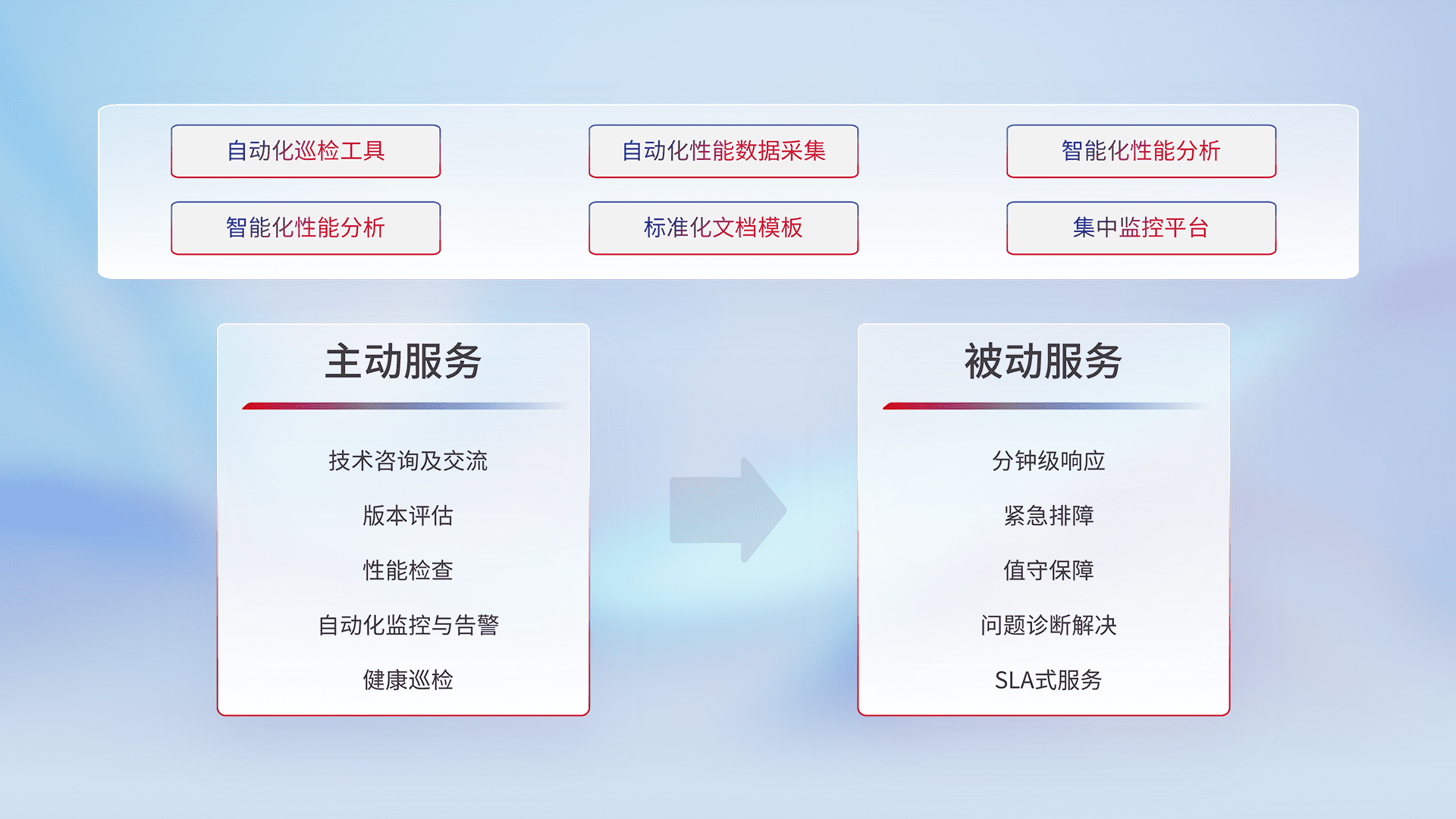 智能化工具和标准化文档,,保障服务质量,,,,提供主动服务(包含技术咨询、、、版本评估、、、性能检查、、、自动化监控与告警、、、、健康巡检)和被动服务包含(分钟级响应、、、紧急排障、、、值守保障、、、、问题诊断解决、、、SLA服务)。。。
